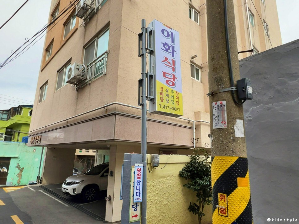 홈플러스에 주차를 하고 걸어간다. 전봇대에 자그마하게 이화집이라고 붙어있다.
