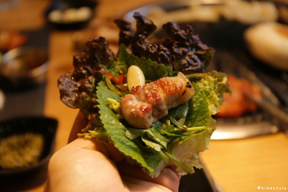 이어서 오겹살 한점과 상추, 깻잎 쌈에 다양한 채소를 넣고 한입 가득 쌈 싸서 맛본다. 먼저 쌈 먹고 뒤에 소주 한잔 걸치면 꿀맛이다. 나는 늘 먼저 안주를 먹고 난 다음에 술을 마신다. 음식의 맛을 제대로 느낄 수 있으며 술맛도 극대화하는 좋은 방법이다.