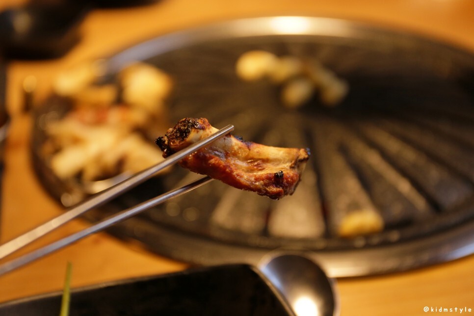 먹기 좋은 크기로 잘 자르고 고기는 거의 다 잘려나간 갈빗대를 나도 하나 구해서 불판 사이드에 굽기 시작한다.