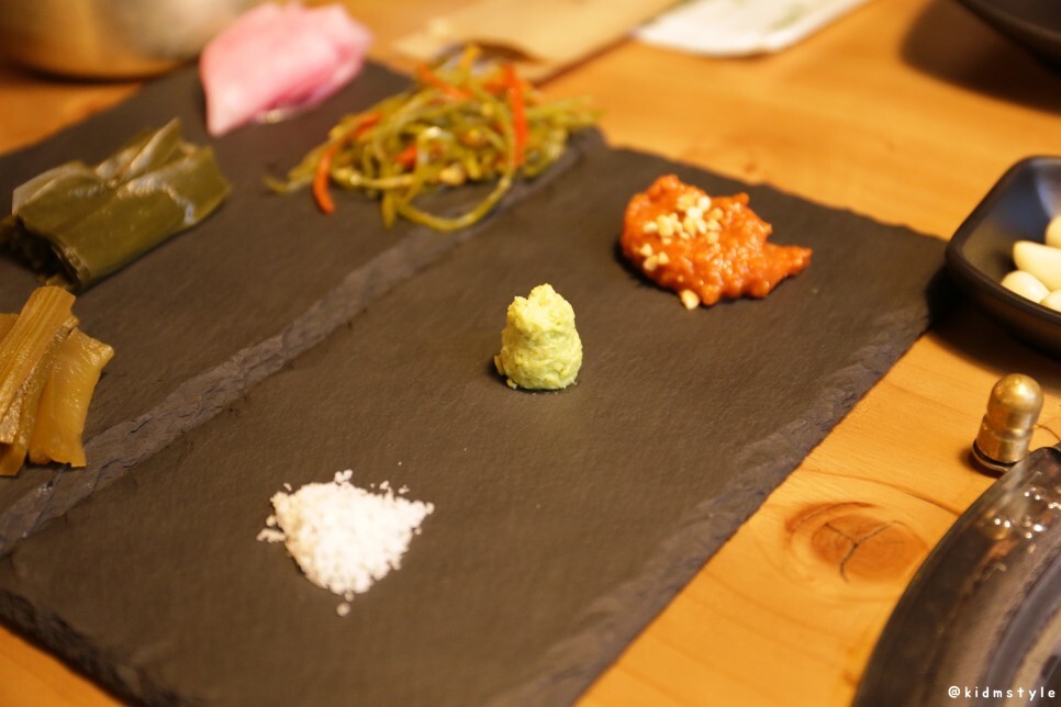 하나하나 깔리기 시작한다. 소금과 생와사비와 쌈장