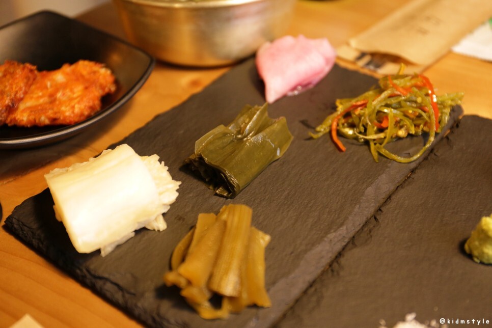 위에서부터 쌈무, 고추지, 명이나물, 씻은김치, 그리고 특이하게 궁채지가 나온다. 짜지 않고 간이 딱 좋아서 자꾸 손이 간다.