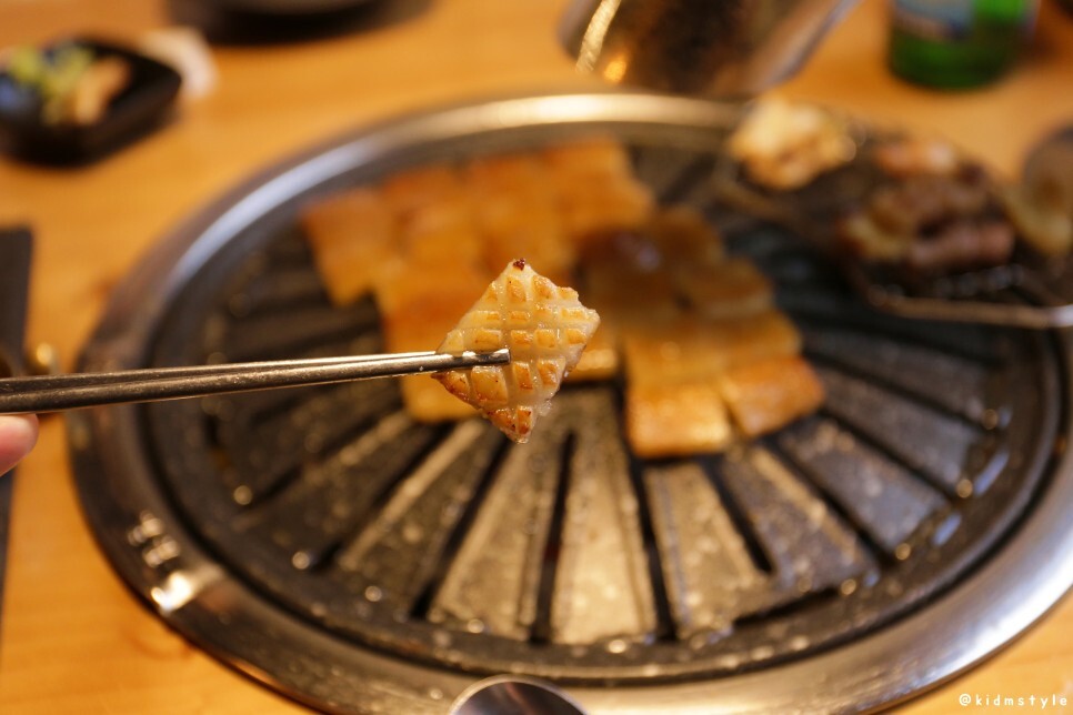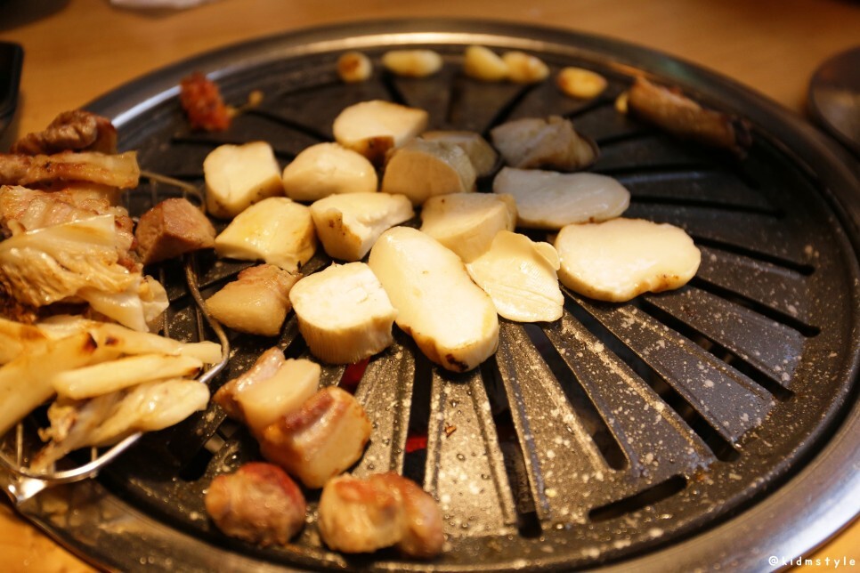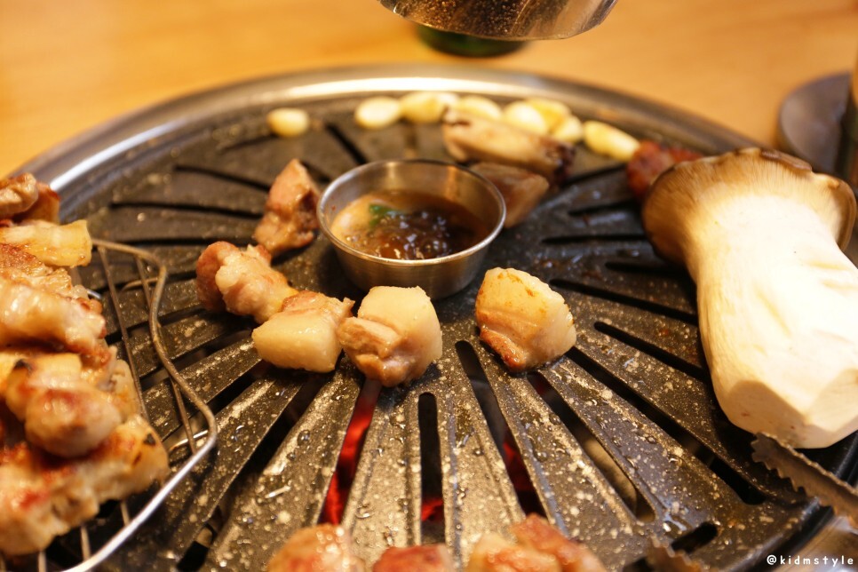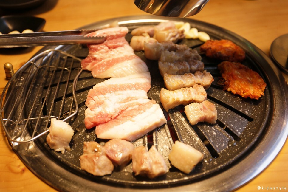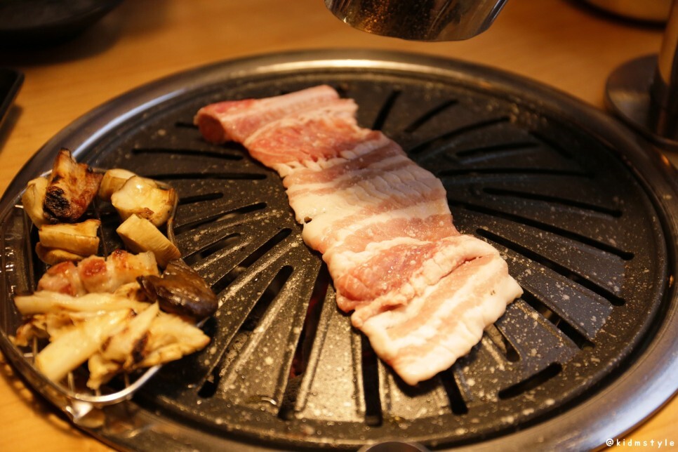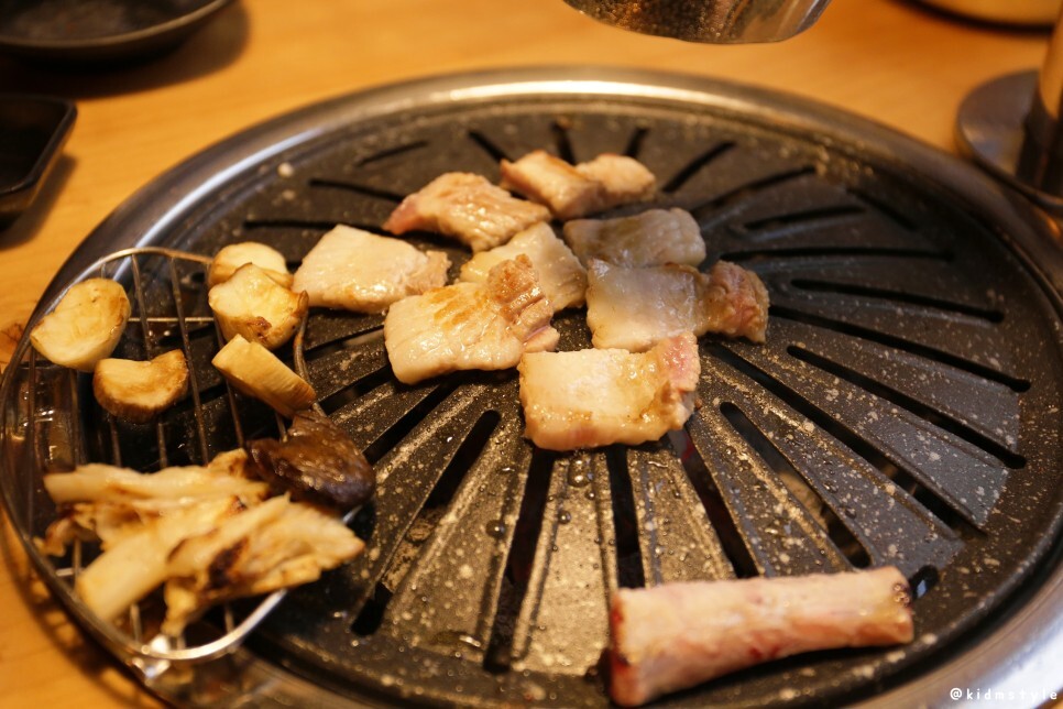한쪽 끝에 김치전을 올려주고 본격적으로 고기를 굽는다. 역시 사장님이라 그런지 고기를 잘 구우신다. 웬만하면 고깃집에서 내가 직접 굽는 편인데 이날은 조금 편하게 먹었다.