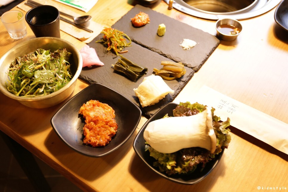 파재래기와 김치전, 상추 깻잎 쌈에 커다란 새송이버섯도 나온다. 김치전은 불판에 데워먹으면 맛있다고 하길래 데워먹었는데 바삭하고 맛이 꽤 괜찮아서 좀 놀랐네.