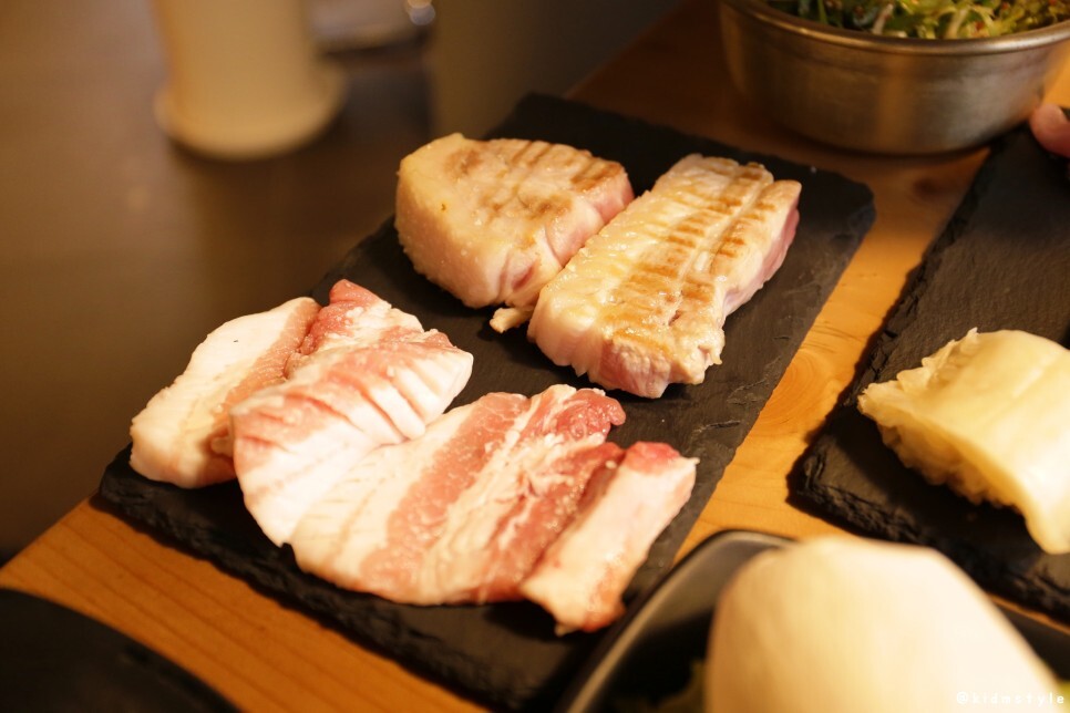 살짝 초벌구이 한 고기가 나왔다. 조명이 아주 따뜻한 색온도라 이렇게 찍혔지만 고기의 상태는 아주 좋아 보인다. 왼쪽부터 생갈비, 목살, 오겹살 순이다.