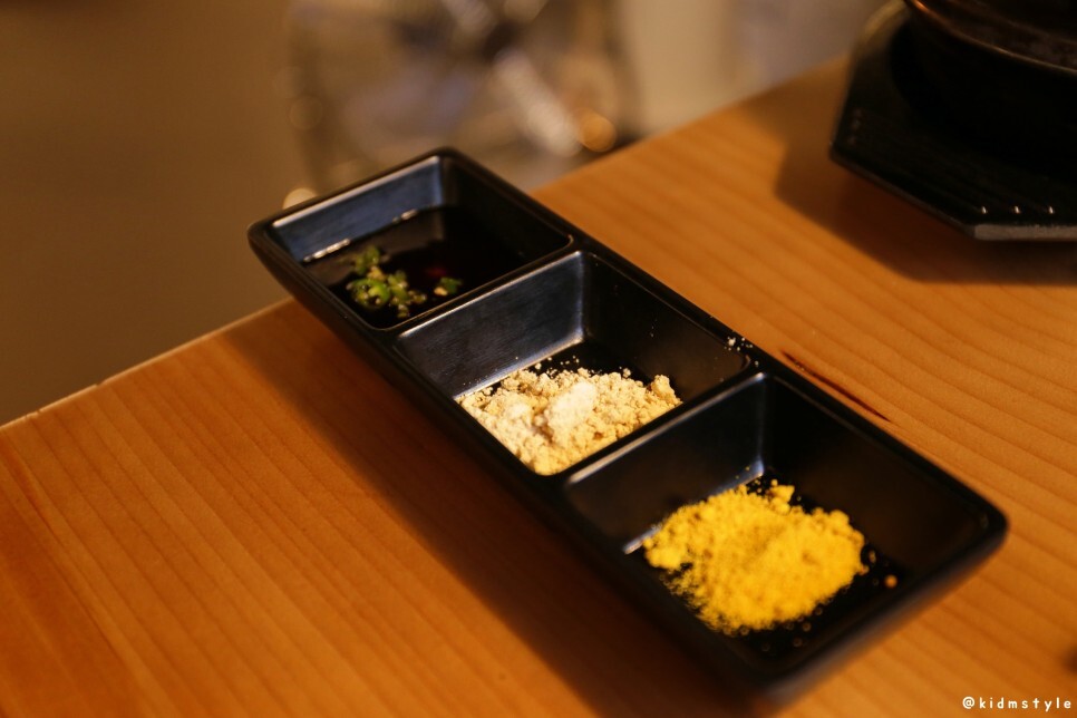 지금부터는 본격적으로 껍데기를 맛볼 시간이다. 왼쪽부터 데리야키 소스, 콩가루, 카레 가루인데 데리야키 소스는 휘저으면 아래에 매운 고춧가루가 들어있어서 잘 섞어 먹으면 된다.