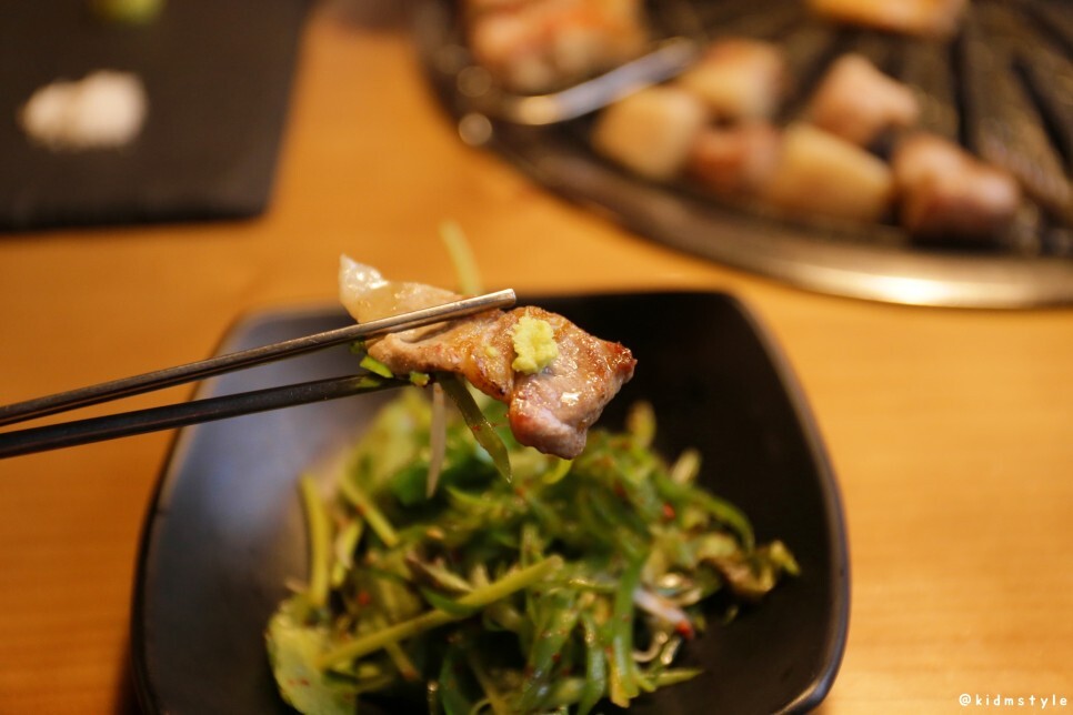 먼저 생갈비에 와사비를 올리고 파재래기와 함께 맛본다. 고소한 게 참 맛있네. 파재래기는 파만 있는 게 아니라 참나물도 들어가 있어서 그 향이 참 좋더라.
