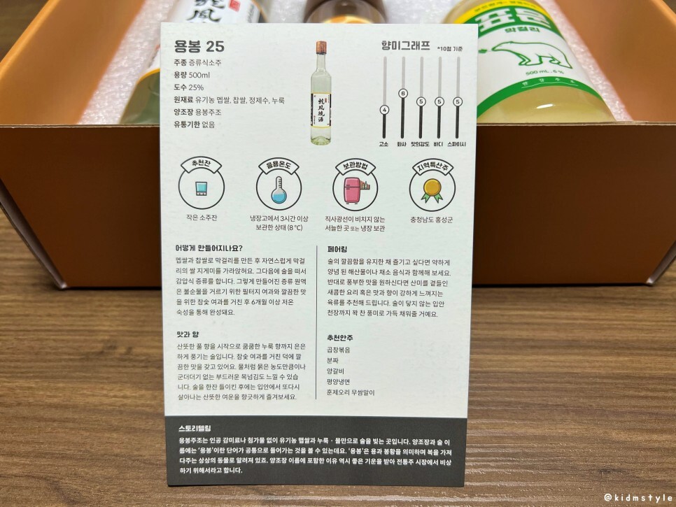 용봉 25에 대한 소개이다. 술마다 이런 큐레이션 카드가 있어서 참 좋다. 물론 술담화 측 소개와 실제 맛본 후기는 비슷한 부분도 있고 다른 부분도 있는데 아무래도 이 정보를 참고하는 게 좋을 것 같다.