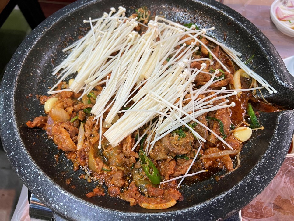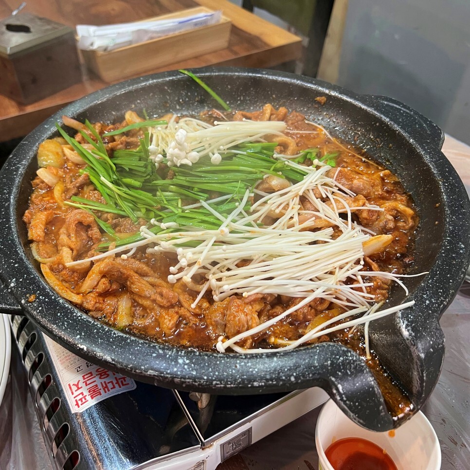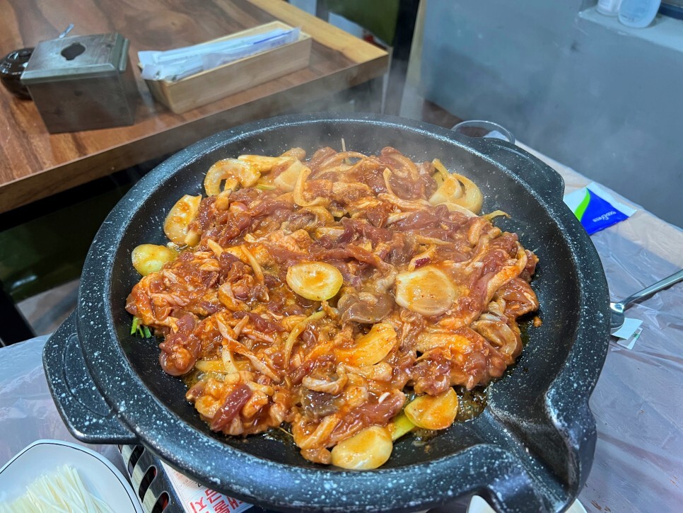 밑반찬으로 감탄하고 있으니 메인이 나옵니다. 오리불고기입니다. 불판 한가득 올라가있는 오리를 보니 너무 좋습니다. 양념이 꽤 잘되어 있는 모습입니다.
