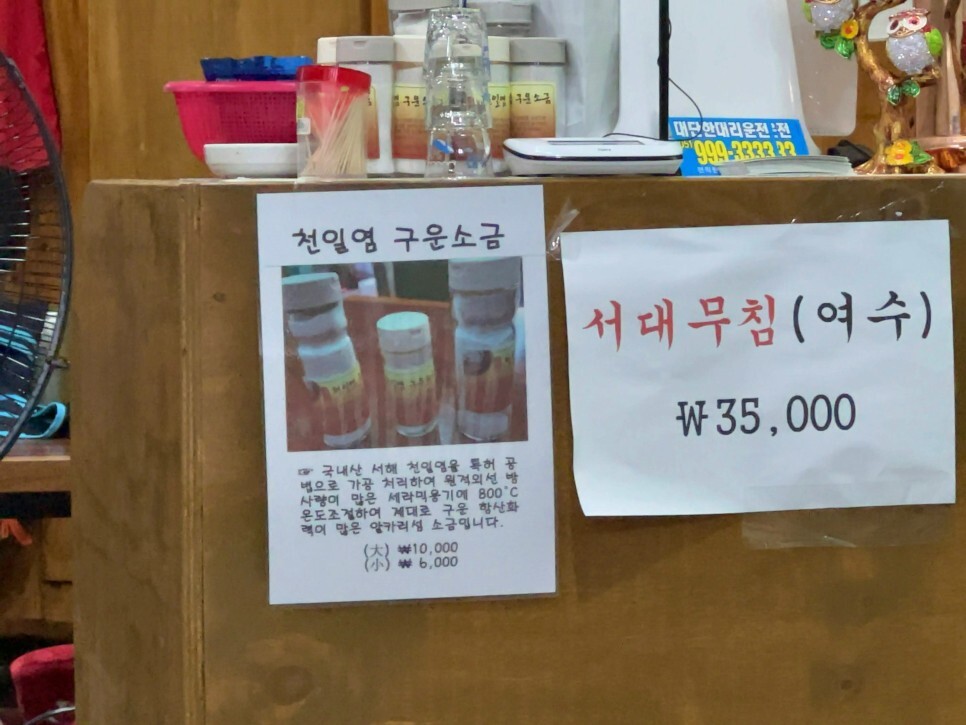천일염 구운 소금과 여수 서대무침도 판매하네요. 어떤 맛일지 궁금해집니다.