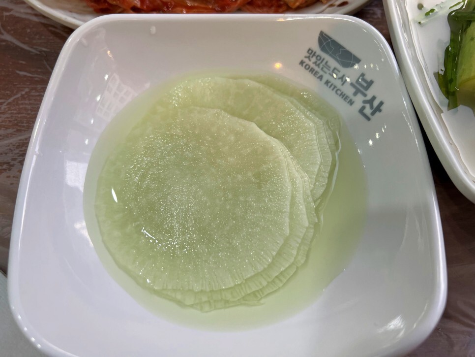 그리고 오이물김치도 맛봅니다. 국물이 시원하면서도 상당히 맛있습니다. 오이도 흐물하게 잘 익었네요. 너무 맛있어서 뭐가 들어갔는지 여쭤보니 황태머리, 대파 뿌리, 고추씨 등을 넣고 만드셨다고 하네요. 사장님 손맛이 상당합니다.