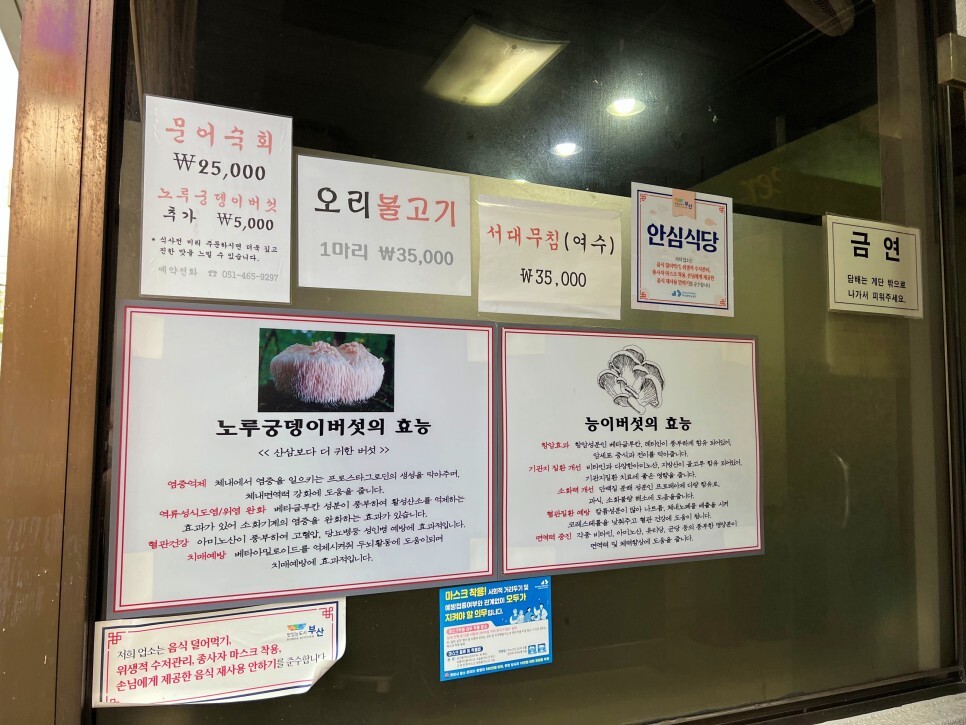 이곳은 안심식당입니다. 안심식당은 '덜어먹기 가능한 도구 비치, 제공', '위생적 수저관리', '종사자마스크 착용'을 준수하는 곳으로 소재지 지자체의 인증을 받은 음식점입니다. 노루궁뎅이버섯, 능이버섯도 맛볼 수 있네요.