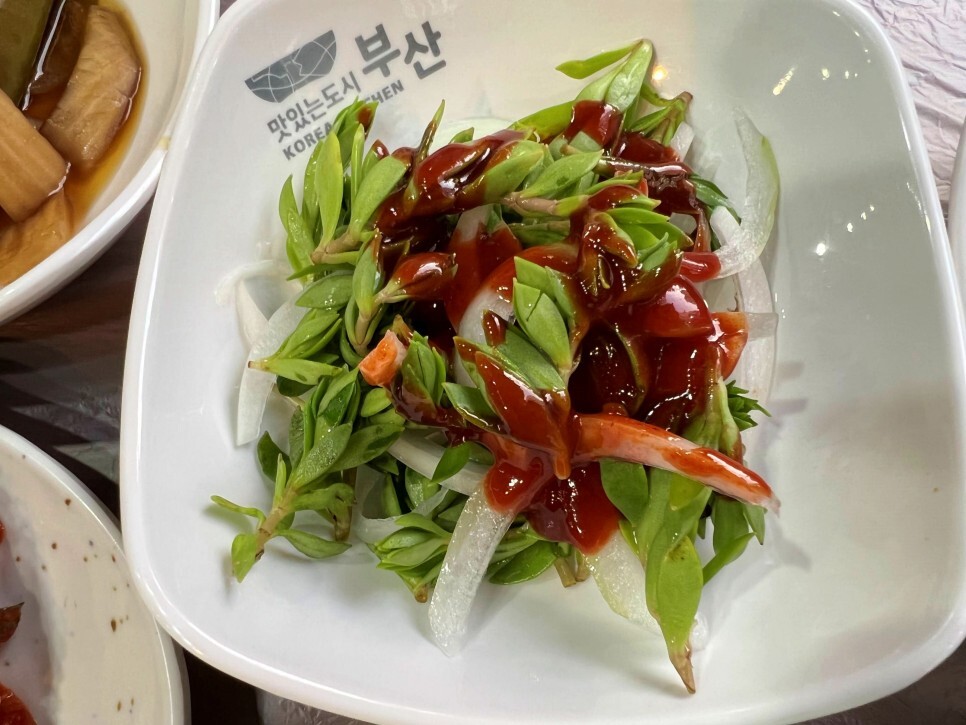 그리고 초장을 뿌려놓은 돌나물입니다. 돈나물이라고도 하죠. 노지에서 채취한 나물이라고 하시네요. 그래서 그런지 통통하고 속이 꽉 차있네요. 참 좋아하는 나물이라 반갑습니다.