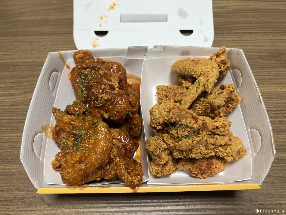 크리스피 닭다리 순삭 하고 양념 닭 다리도 집어본다. 잡내 없고 바삭하게 잘 익혀서 맛이 좋다. 치킨에 파슬리 가루를 뿌려놔서 보기도 좋네.