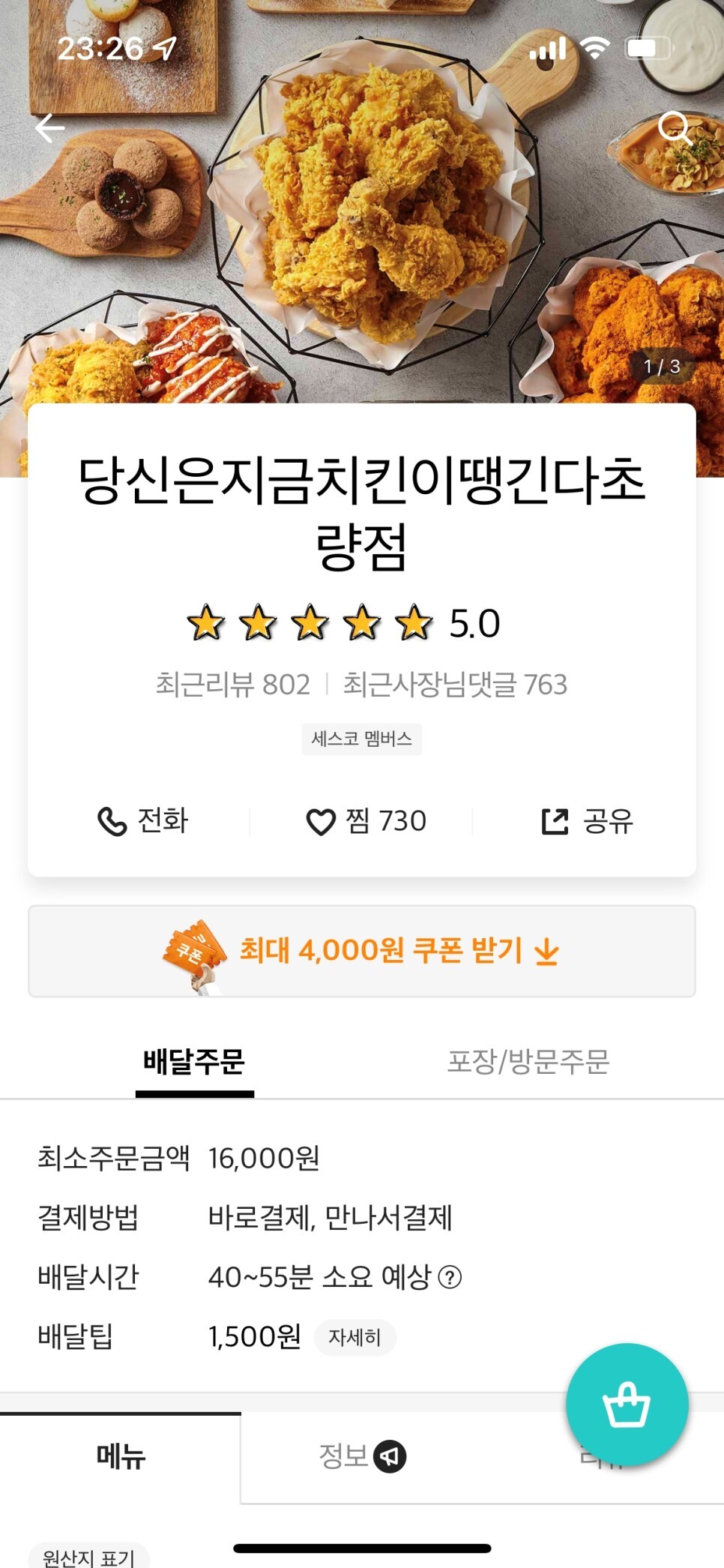 오른쪽 아래에 보면 쿠폰이 눈에 띈다. 배민으로 흐름이 바뀌고 쿠폰 제공하는 가게가 거의 없는데 너무 반갑다. 그리고 요즘 치킨이 2만 원이 훌쩍 넘어가는 상황에 당치땡은 조금 저렴한 편이다.