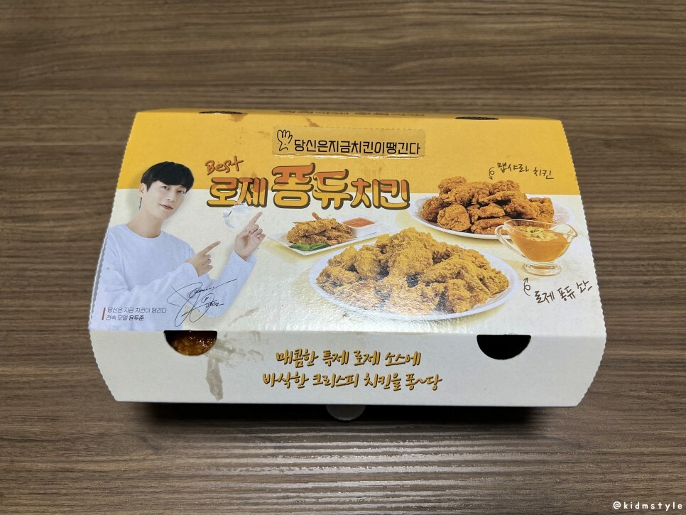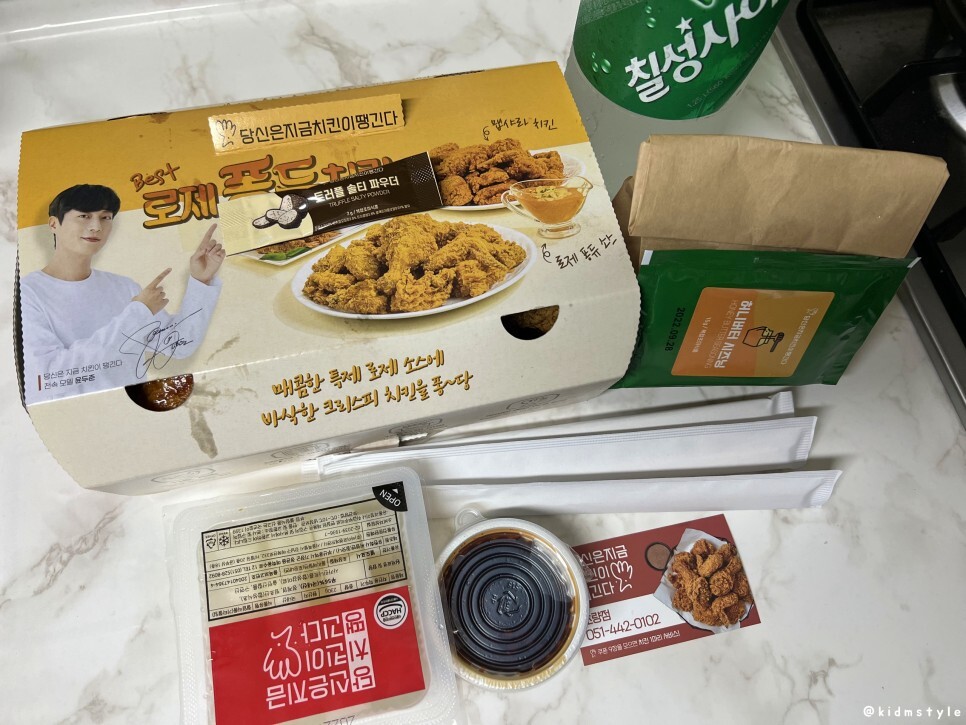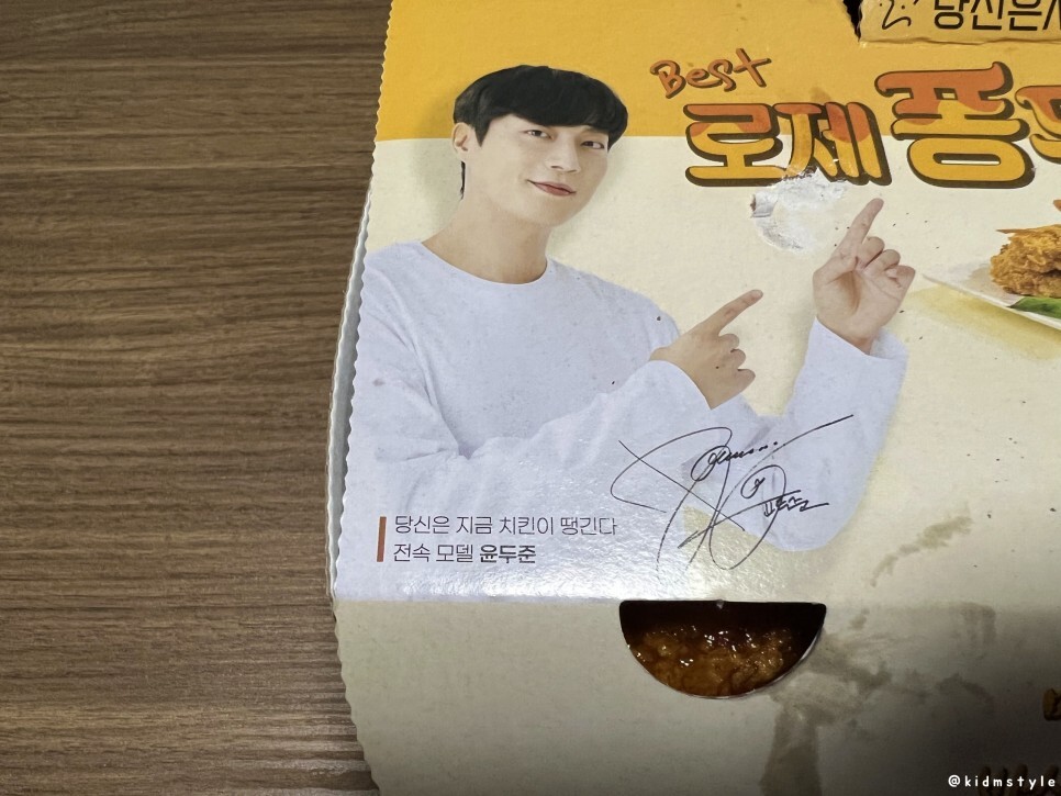 뭐가 들어가 있는지 일단 다 꺼냈다. 배우이자 가수인 윤두준의 얼굴 오래간만에 본다. 요즘 구필수는 없다라는 넷플릭스 드라마가 인기라던데 거기서 PPL로 당치땡이 나온다고 하네. 그래서 당치땡이 구필수 치킨이라는 별명도 있더라. 앞서 말했지만 당치땡은 당신은 지금 치킨이 땡긴다!의 약자이다.