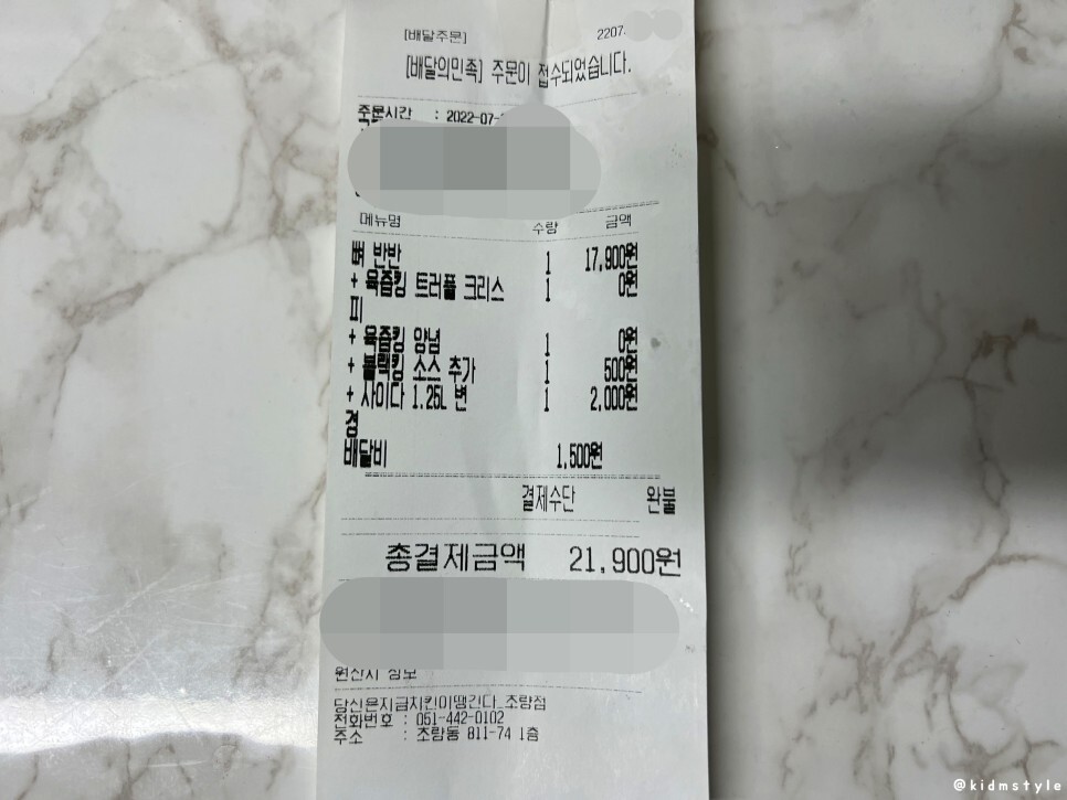 배달료 포함, 쿠폰 할인 적용해서 총 결제금액은 20,900원이다. 종이 영수증에는 쿠폰 할인이 안 찍혔네.
