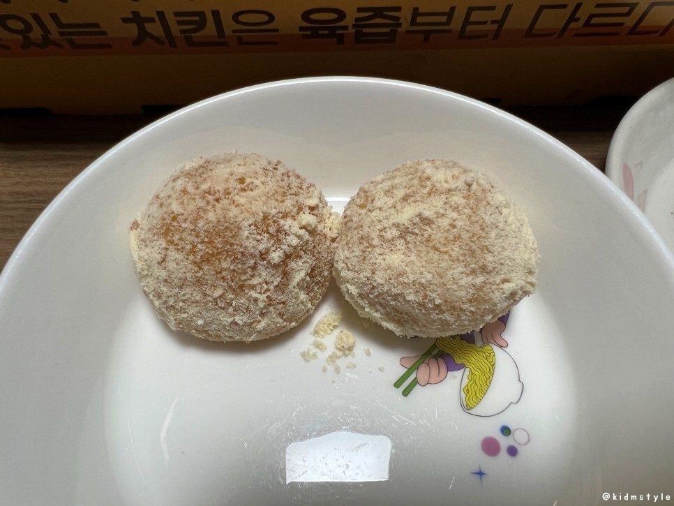 사진 찍기 위해 접시에 치즈볼 먼저 담아주고 가루 역시 접시에 담았다.