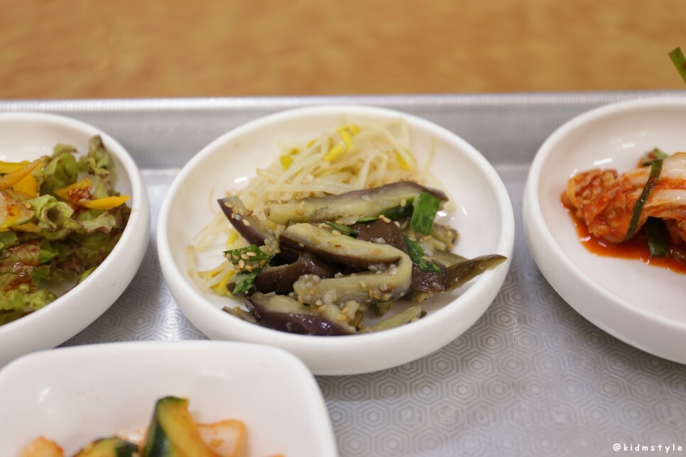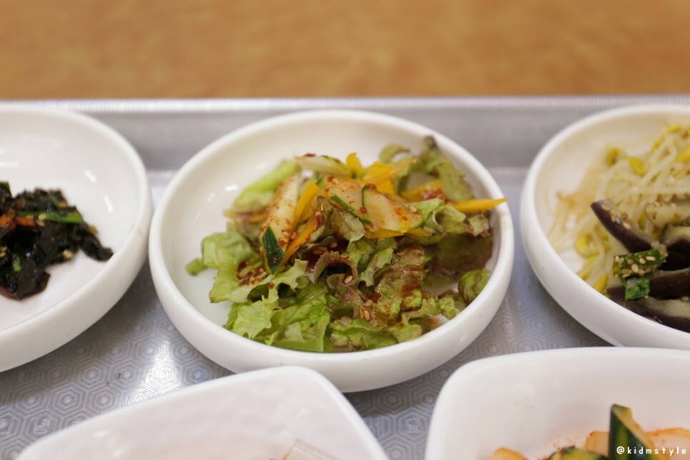 마른 파래무침, 상추 겉절이, 콩나물무침, 가지볶음, 김치, 명태포무침, 우뭇가사리무침, 오이무침