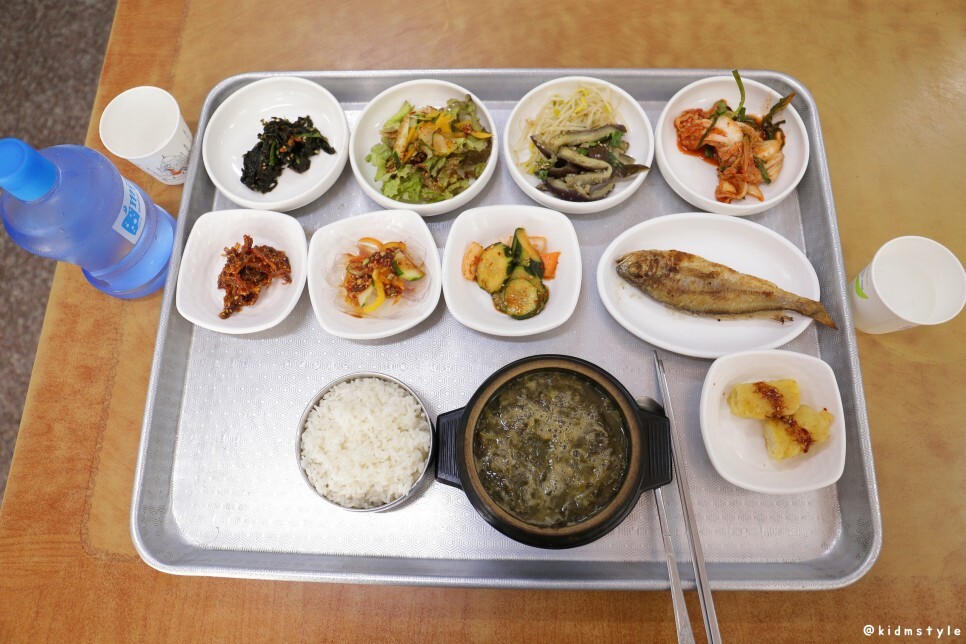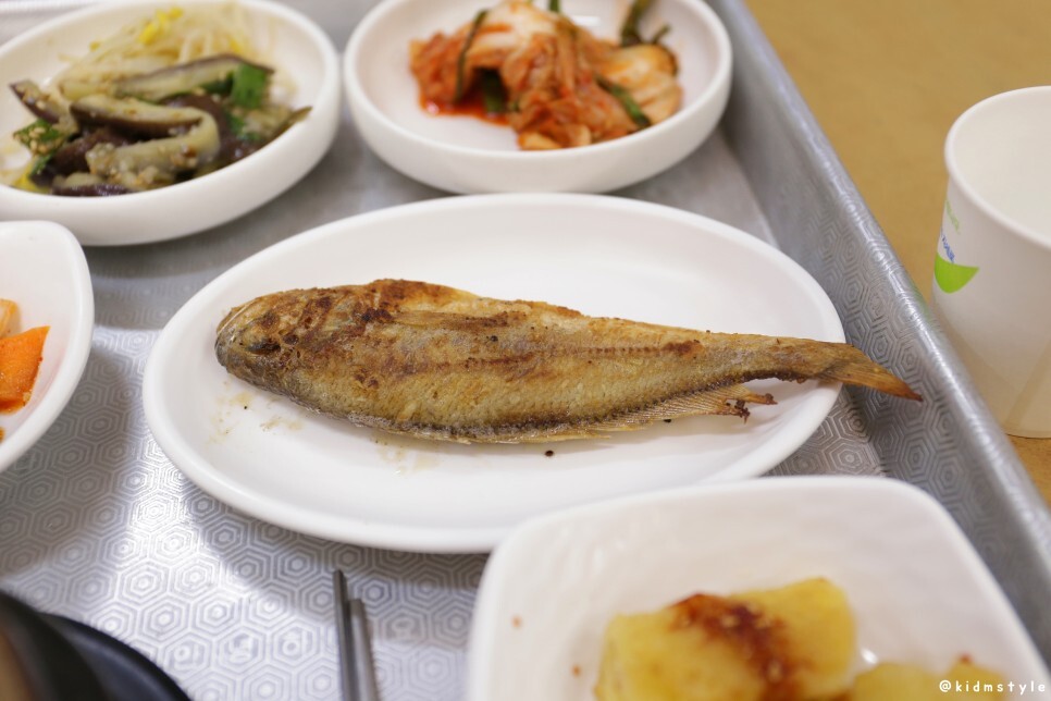 지지직~ 굽는 소리가 들리던데 이윽고 생선이 하나 나오네? 그리고 오징어튀김까지. 반찬은 10가지, 밥, 그리고 시락국까지 한 끼 하기에 부족함이 없다. 고기가 있었다면 금상첨화였겠지만 이 정도도 충분하다.