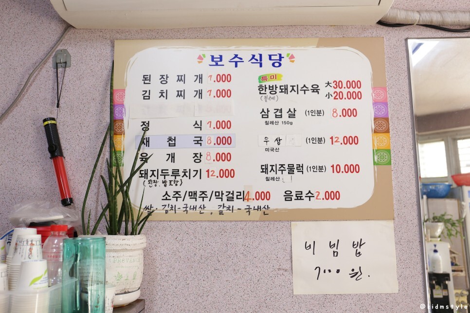 최근에 1,000원씩 올린 메뉴판이다. 이 집은 동네 분들에게 인기가 많은 정식집이다. 저녁에는 수육, 삼겹살, 주물럭 등으로 술도 한잔 걸칠 수 있는 사랑방 같은 공간이다.