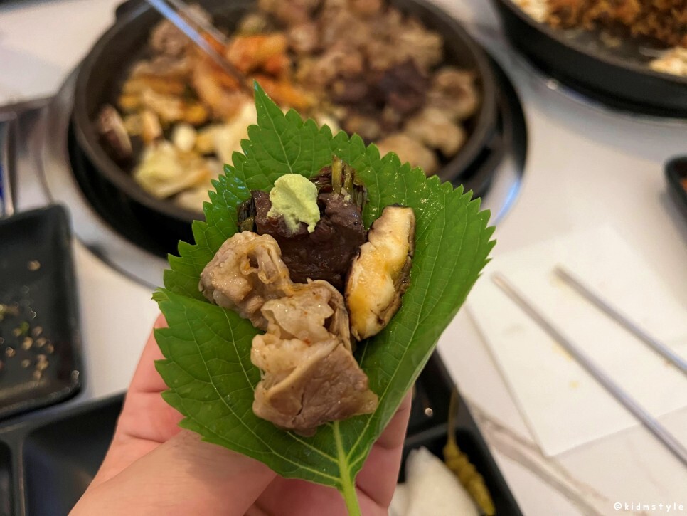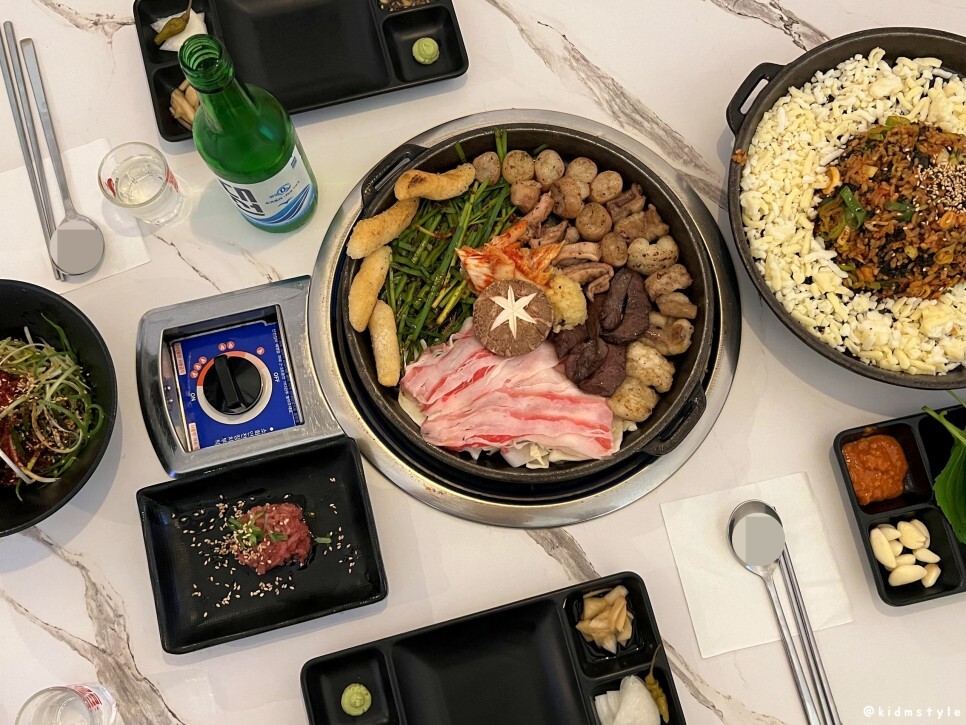 구운 떡, 부추, 우삼겹, 우삼겹 밑에 양배추, 염통, 막창, 대창, 곱창 등으로 구성되어 있다. 표고버섯과 김치, 다진 마늘이 가운데에 올라가 있다.