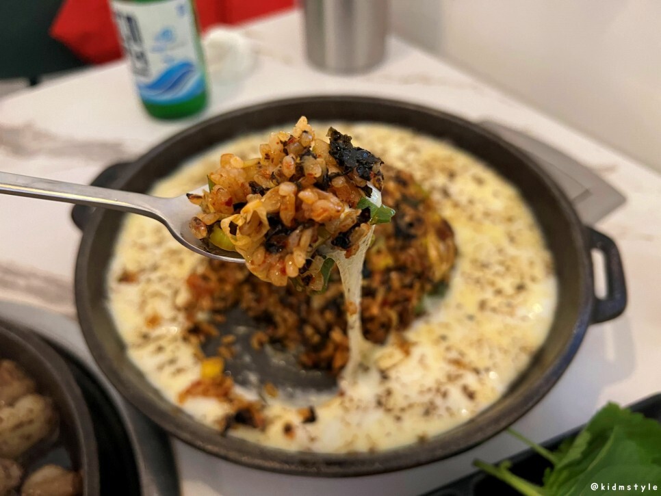 치즈 쭉쭉 늘어나는 볶음밥 한 숟가락 해본다. 탄수화물 보충 완료.