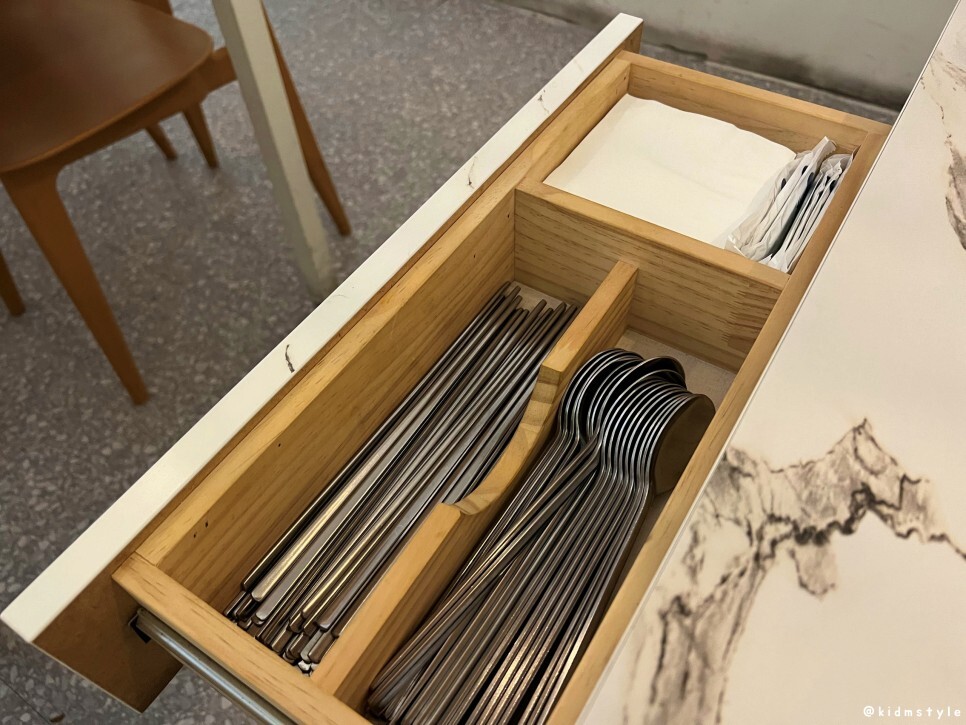 냅킨, 물티슈, 수저는 테이블 옆 서랍에 있고