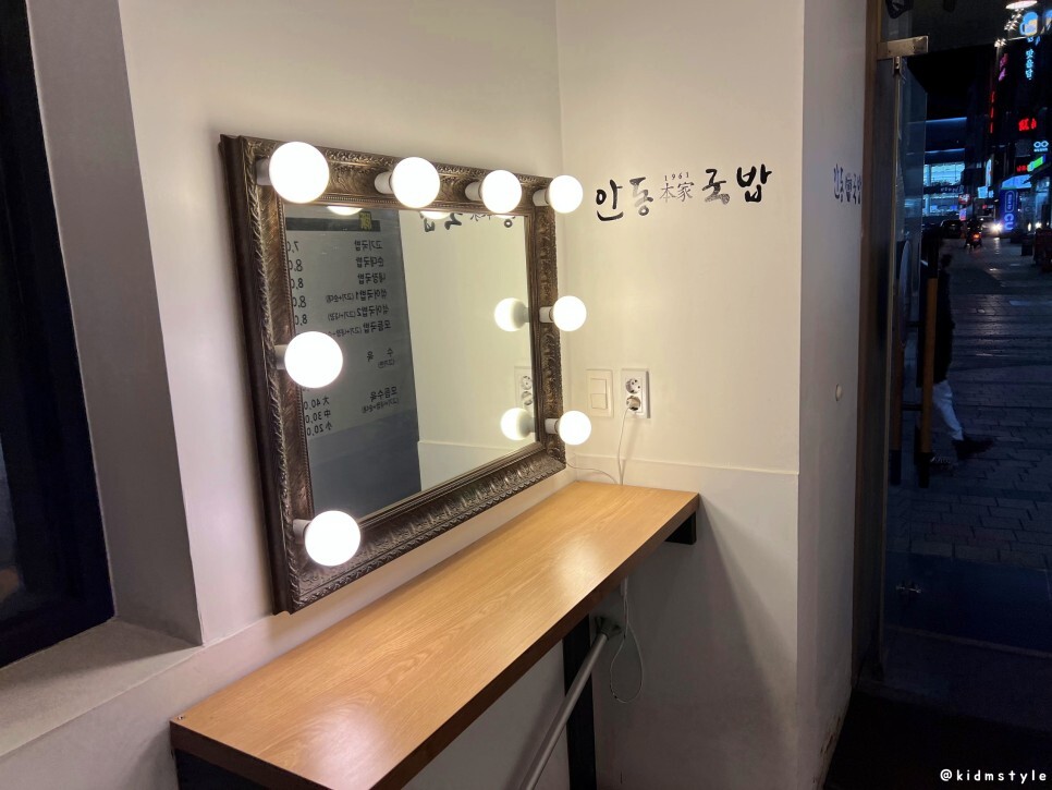 식사 후 잠깐 얼굴을 고칠 수 있게 거울과 조명이 놓여있고 입구에 메뉴판이 붙어있어서 미리 살펴볼 수 있다.