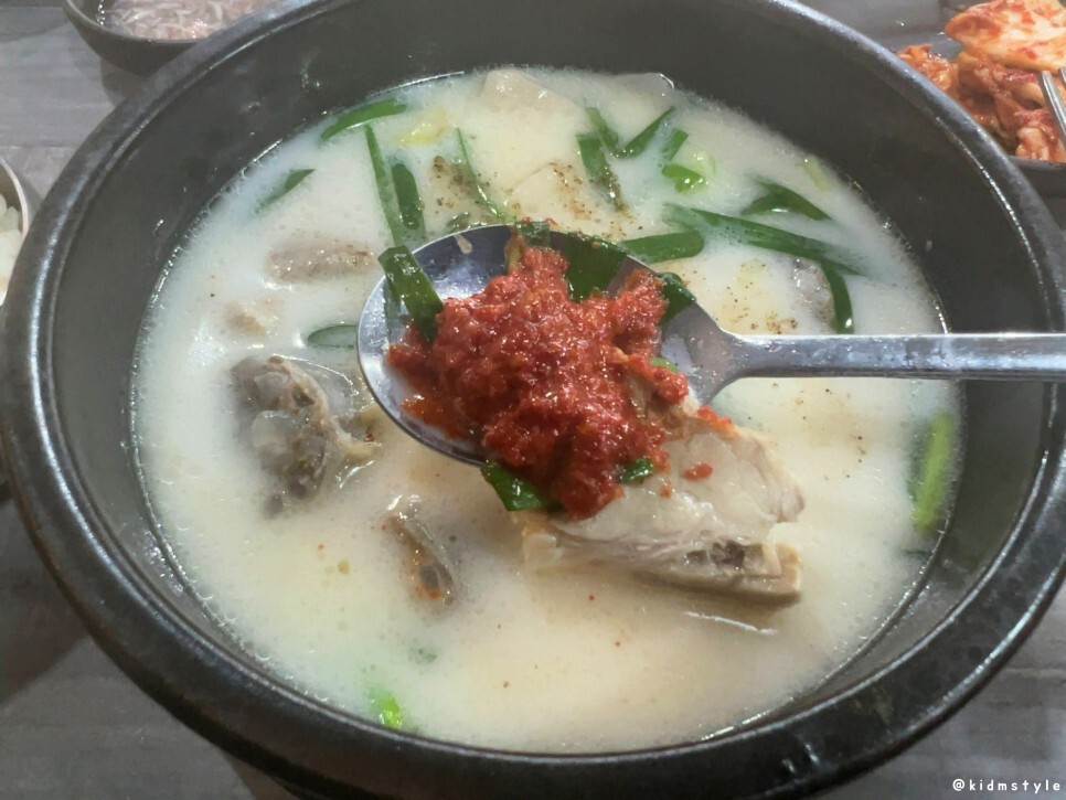 건더기는 적당히 있는 편이다. 국물을 맛보았다. 간이 전혀 안 되어 있는 사골 진국 같은 느낌이다. 제대로 고은 사골국물이라고 할까?