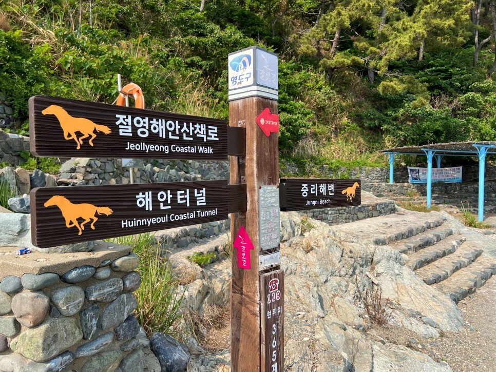 절영산책로의 포토 핫플인 해안터널을 지나서 쭉 걷다 보면 이정표를 만날 수 있는데요. 이정표에 그려진 귀여운 말 모양이 인상적입니다.