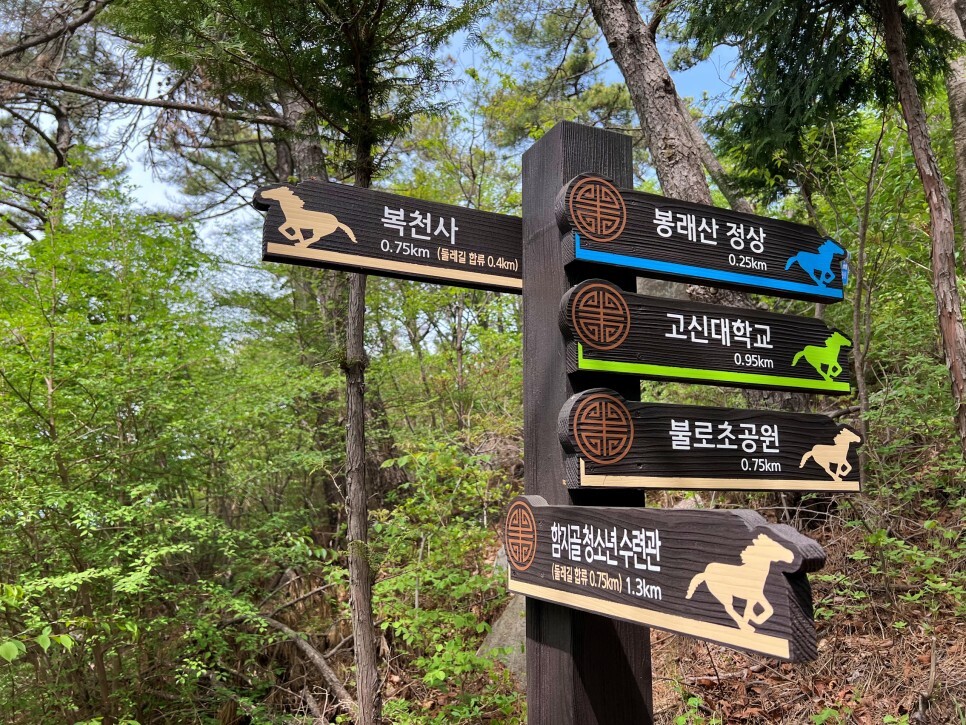 봉래산 둘레길을 걷다 보면 이정표를 볼 수 있는데요. 역시 말이 귀엽게 그려져 있네요.