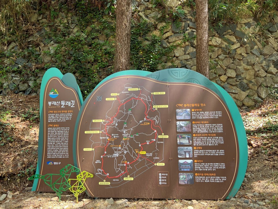 그리고 다른 날 봉래산을 찾았습니다. 영도의 봉래산은 섬 한가운데에 우뚝 솟아 있어서 사방으로 보는 경치가 아주 장관인 산이에요. 봉래산 둘레길을 걸으며 만났던 안내판입니다. 아래에 녹색과 연두색의 말 모양이 참 귀엽습니다. 왼쪽에 절영도의 유래에 대해 적혀있습니다.