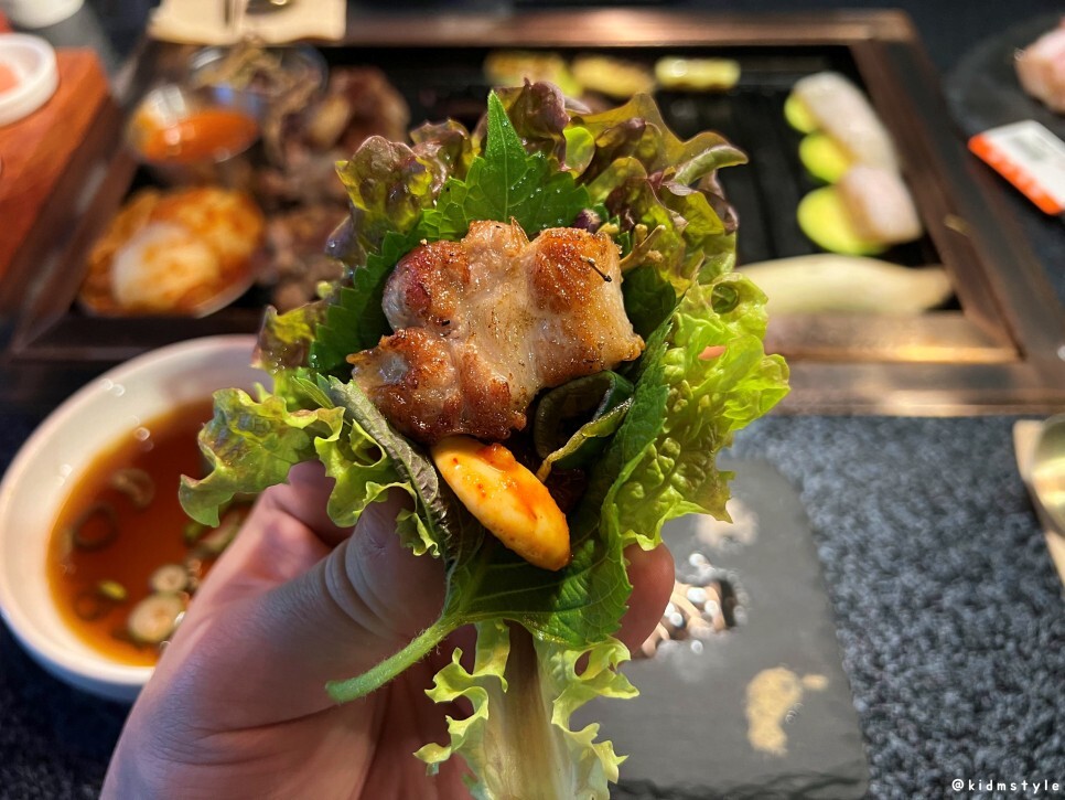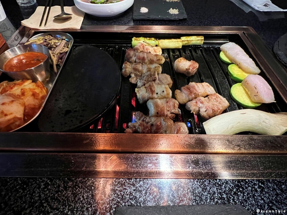 삼겹살을 먹기 좋게 하나하나 불판에 올려주고 애호박, 대파, 새송이버섯까지 열심히 구워준다.