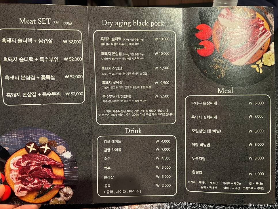 첫 방문이라 사장님께 물어보니 아주 친절하게 알려주시네. 세트 메뉴를 추천하신다. 흑돼지 숄더랙+삼겹살 세트로 주문하였다. 네이버 마이플레이스를 보니 현재 가격은 54,000원으로 올랐더라.
