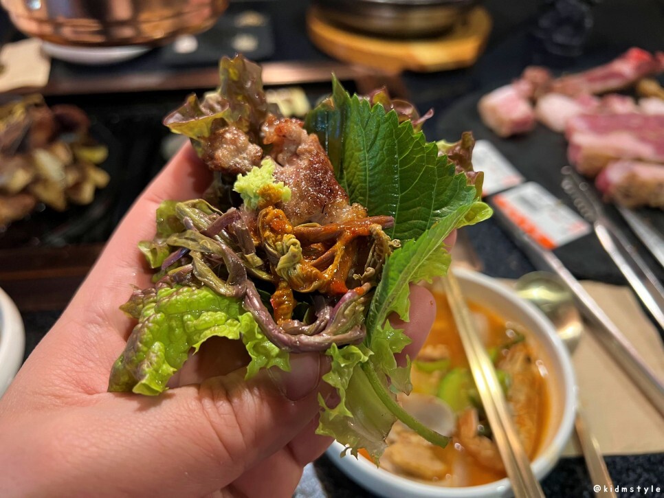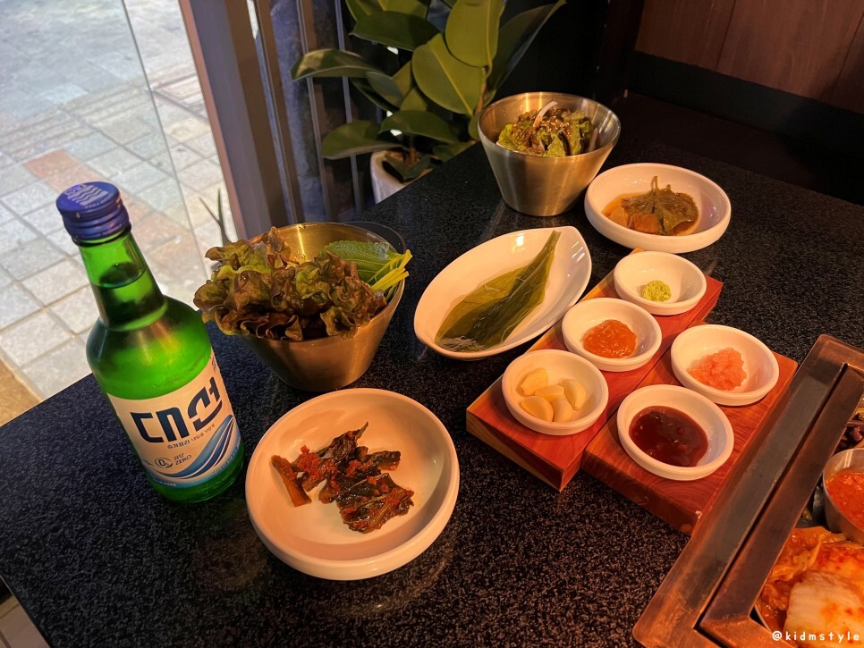 상추와 깻잎에도 쌈 싸 먹어본다. 먹고 소주 한 잔 바로 이어지는 코스.