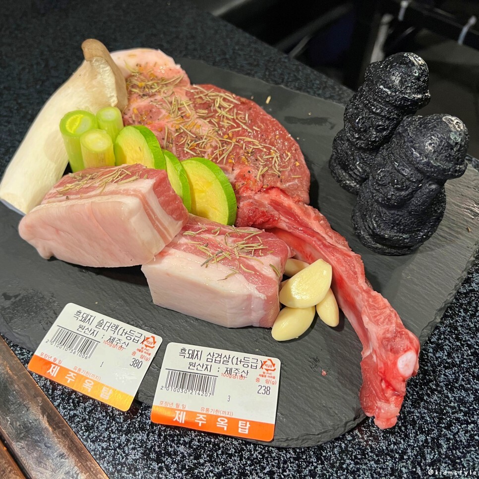 주문한 흑돼지 숄더랙과 삼겹살이 등장했다. 하르방도 찬조 출연이다. 너무 귀엽네. 고기 때깔을 보니 굽기 전부터 맛있는 고기라는 것이 딱 느껴진다.