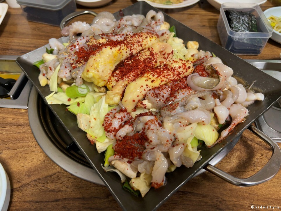 철판 위에 채소가 깔리고 그 위에 주꾸미, 한우곱창 등이 올라간다.