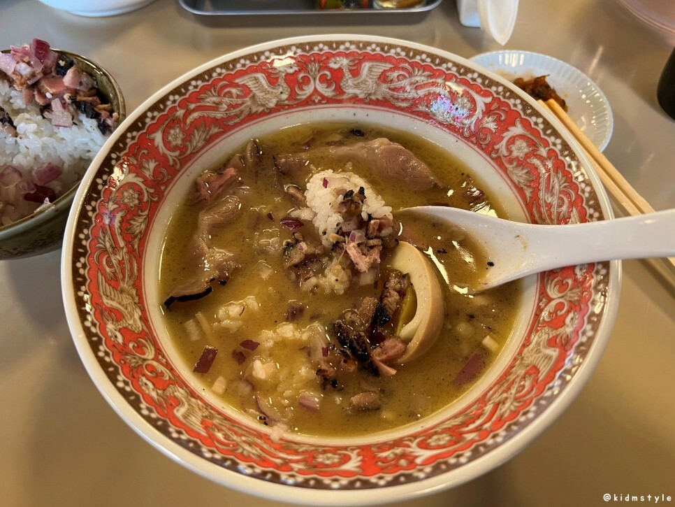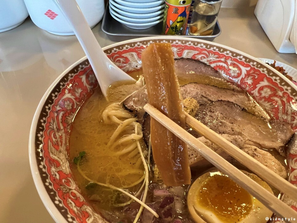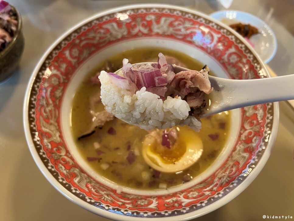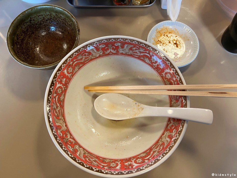 열심히 말아본다. 배가 부른데 계속 들어간다. 국물의 간도 딱 좋고 밥과의 조화도 참 좋다. 물론 여기서 말하는 국물의 간은 일본라멘 특유의 높은 염도를 염두에 둔 간이니 참고하기 바란다.