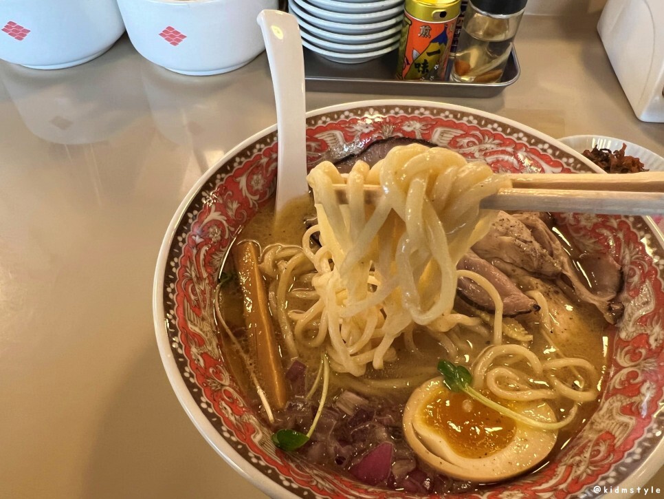 면은 조금 굵은 편이다. 면발의 익힘 정도는 카타인 것 같다. 꼬들꼬들한 식감을 제공해 준다. 개인적인 의견으로는 굵은 면도 좋지만 얇은 면으로 맛보면 훨씬 더 좋을 것 같다. 면의 선택권이 주어졌으면 하는 바람을 혼자 생각해 보았다.