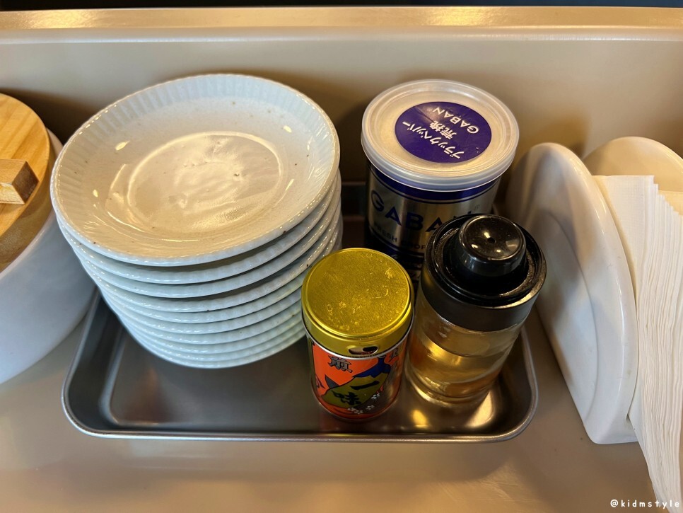 앞접시와 고춧가루, 다시마 식초, 후추 등이 놓여 있다. 그리고 왼쪽에는 갓절임, 비트물 들인 무절임도 있다. 취향껏 덜어먹으면 된다. 예전에 이웃 hans님의 후기를 봤을 때는 갓절임 대신 우엉조림이 나왔다고 얼핏 본 것 같은데 아마도 바뀐 것 같다.