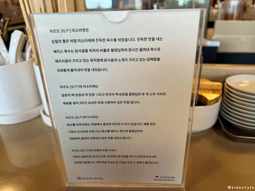 좌석에는 이렇게 설명이 잘 되어있다. 미소라멘, 미소타레(된장소스), 다시마, 차슈 등에 관해 상세하게 설명을 해놔서 이 음식을 처음 접하는 사람도 그 내용을 잘 알 수 있도록 도움을 준다.