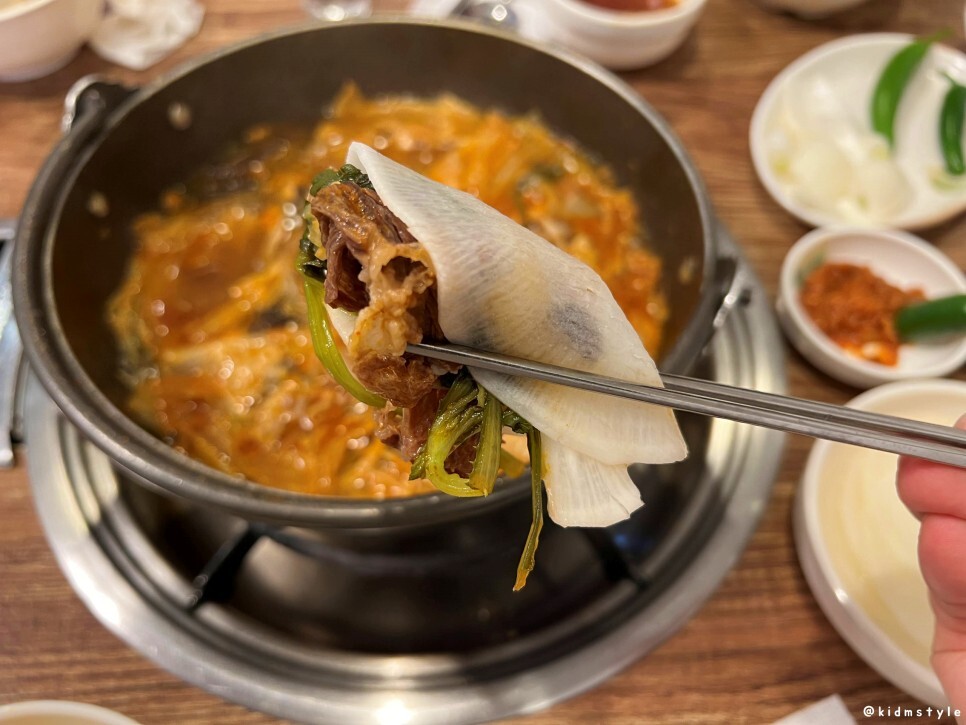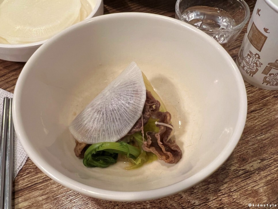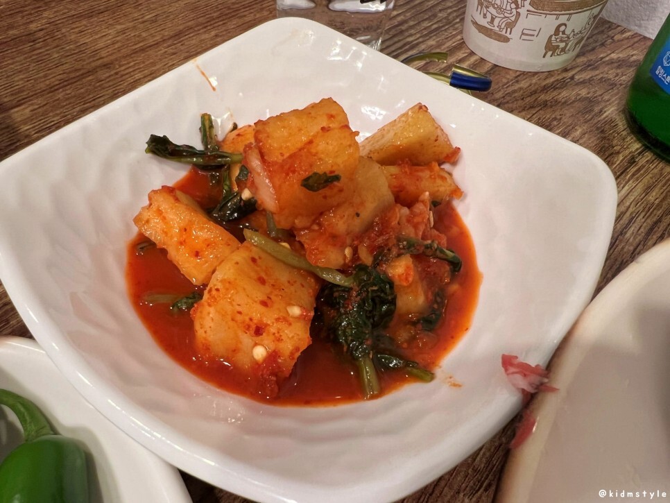 상추 중간에 고기를 비우고 나서 무절임을 올려놓고 싸 먹을 때 하나씩 넣어먹으라 하시네. 유쾌하고 농담하실 줄 아는 친절한 여 사장님이다. 후기에 보면 불친절하다는 얘기가 간혹 있던데 부산 사람 특유의 투박함이지 불친절은 아닌 듯하다.