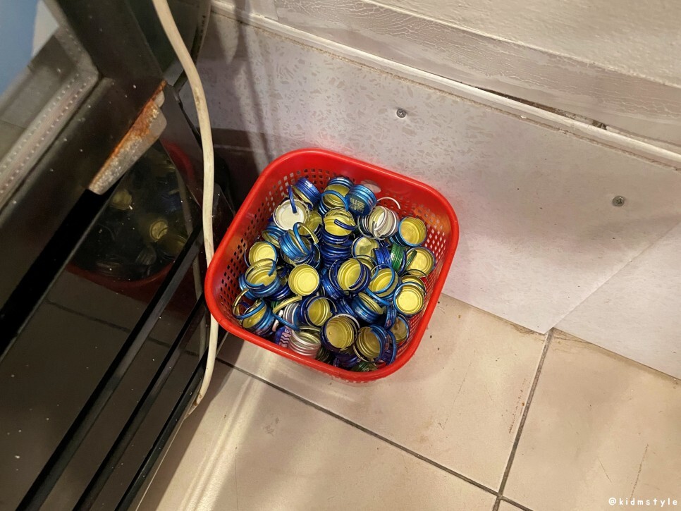 한쪽 구석에 병뚜껑을 모으길래 우리가 먹은 2개도 던져 넣었다.