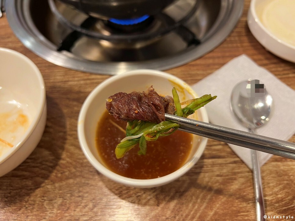 고기 먼저 한 점 집어서 소스에 찍어 먹으니 꿀맛이다.