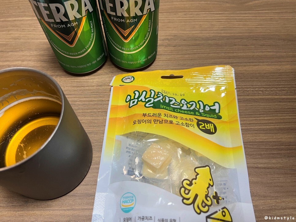 맨입으로 먹어보니 조금 짭짤하더라. 그래서 맥주를 가지고 왔다.