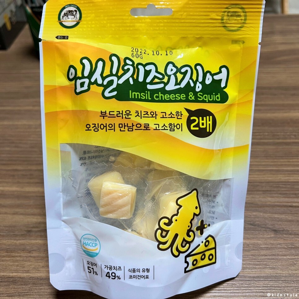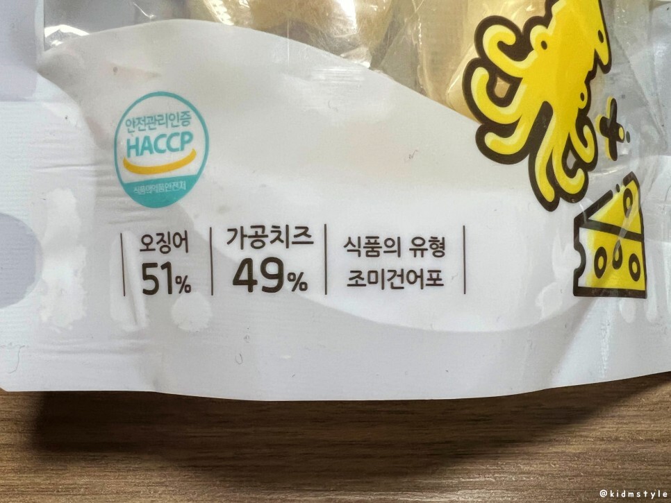 오징어 51%, 가공치즈 49%로 구성되어 있다. 식품의 유형은 조미건어포이다.