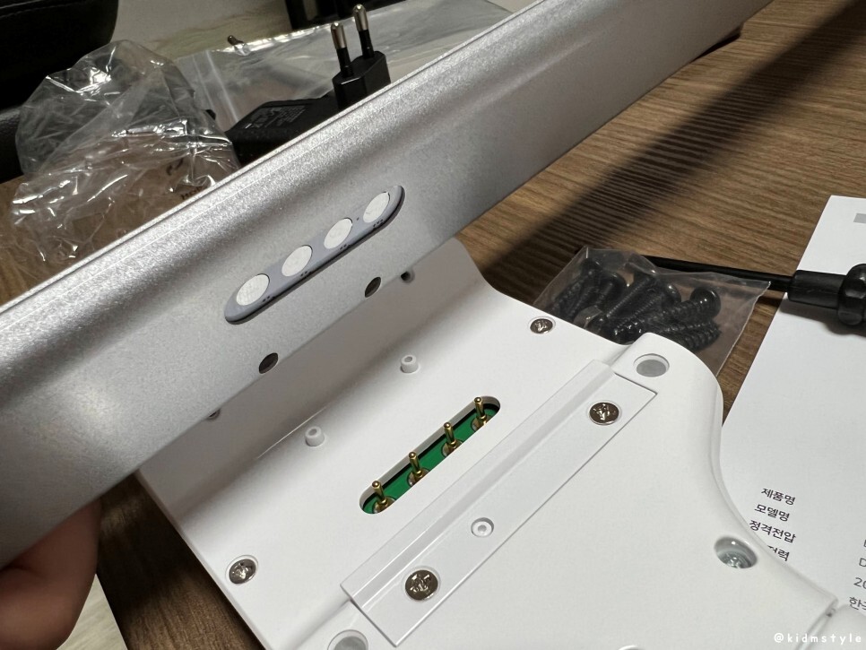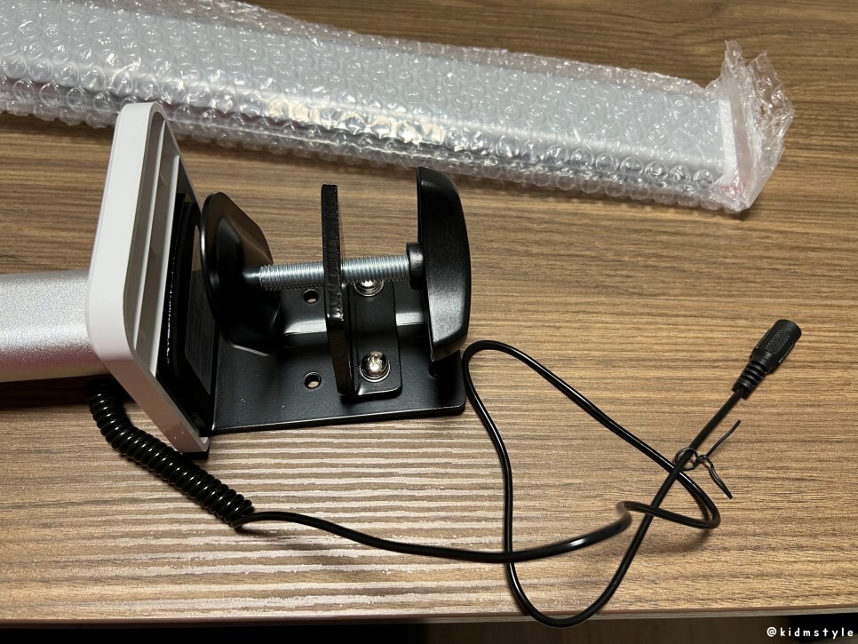 클램프 구조이다. 책상에 거치하면 된다. 케이블에 어댑터를 꽂으면 전원이 연결되는 구조이다.