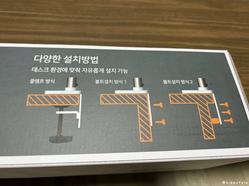 클램프형은 3가지 방법으로 설치가 가능한데 나는 클램프 방식으로 설치할 생각이다. 책상의 형태에 따라서 설치 방식을 선택하면 된다.
