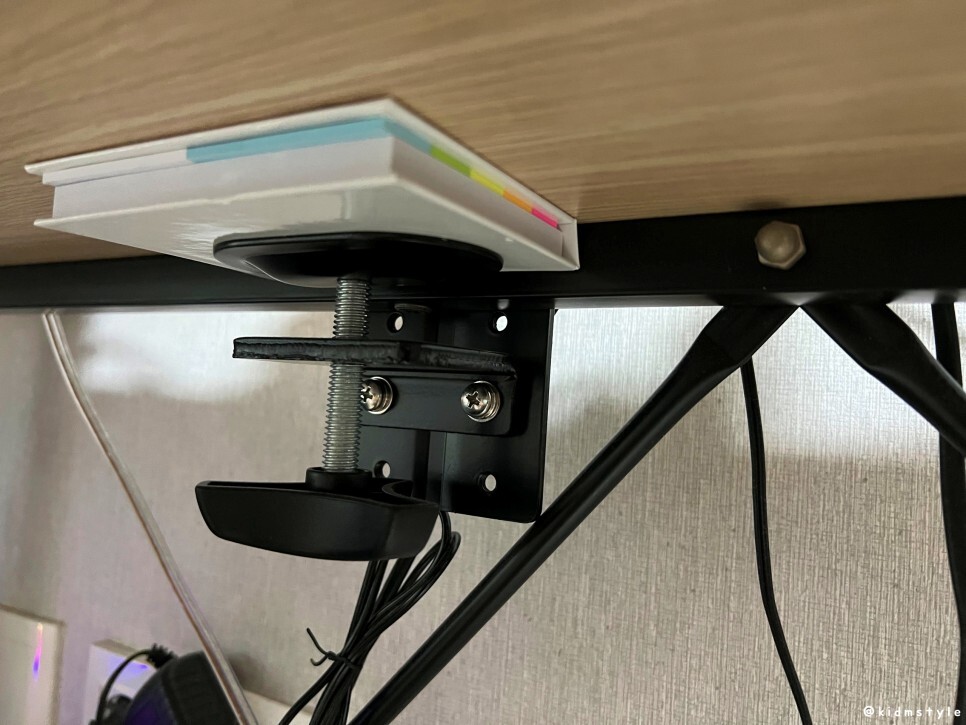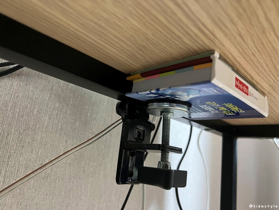 현재 사용 중인 책상 상판의 아래쪽을 보면 클램프를 고정하기가 어려운 구조이다. 이럴 때 두꺼운 종이 등을 받쳐서 두께를 맞추면 클램프가 제대로 고정된다. 이런 형태의 책상을 사용하는 분들에게 사소하지만 꿀팁이 되는 부분이다.