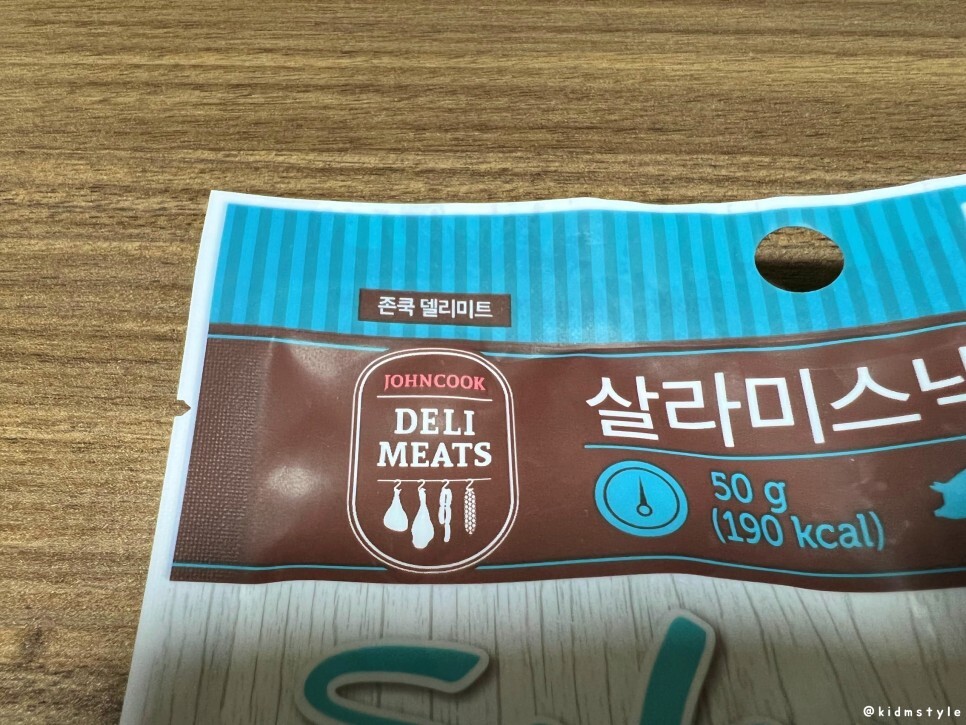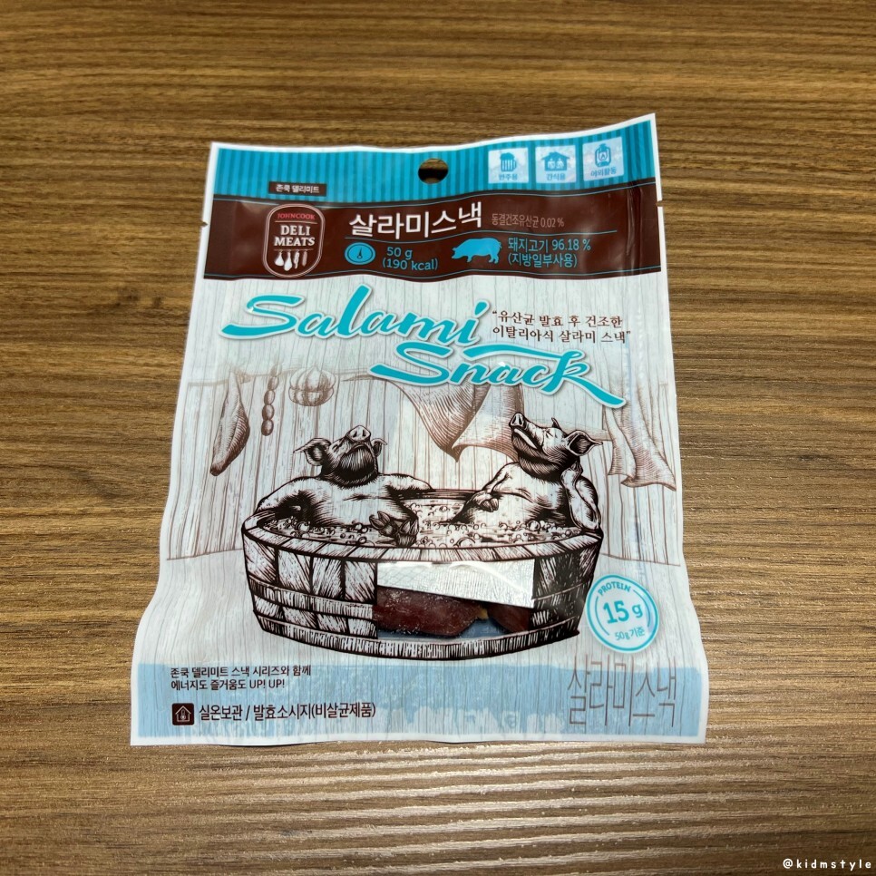 존쿡 델리미트 시리즈 중 하나인 살라미스낵이다. 본 제품 50g 짜리가 대형마트 기준 3,500원 정도 한다. 목욕을 즐기고 있는 돼지 2마리의 표정이 아주 여유로워 보인다.